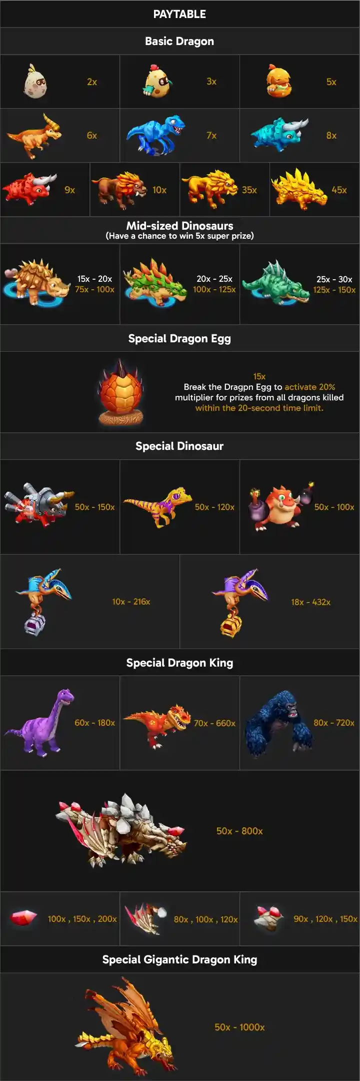 Special Dragon Kings: Every time two Special Dragon Kings are defeated, players enter a random chance to turn on the "Dragon King Showdown" mode. In such a mode, five rounds of guessing are committed, and the winner in each round can raise their multiplier with the highest basic bonus up to X5.
