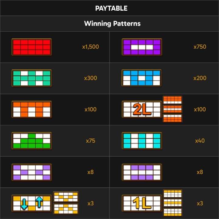 All prizes in the Win Cai Shen Online Game are a card's bet multiplied by the corresponding multiplier. If the winning prize covers another, only the biggest one is awarded. Players win by completing specific patterns on their bingo card, similar to the rewarding gameplay found in Jili Games. Common patterns include: