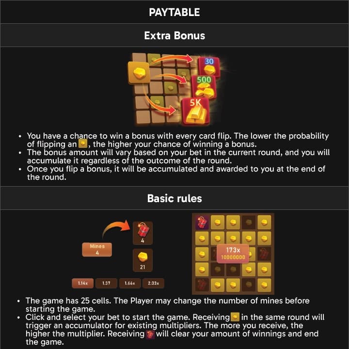 Mines Gold introduces a few exciting features to keep players entertained: